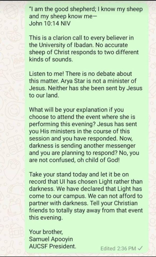 Intermezzo, Zik Hall. Stopping here to charge my phone, I become all too aware of the controversy surrounding this event at this point. Our daddy-in-the-Lord has spoken, Ayra Starr is naught but a messenger of darkness, clad in miniskirt and that oh-so reprehensible device, makeup. To reduce a Grammy-nominated phenom to little more than a device for lust, an agent of your own sexual desire is beyond me, yet that seems to be the consensus among many so-called believers. And for this to happen now, with no similar backlash at other times when secular artistes such as Ckay and Blaqbonez were set to perform at the University of Ibadan speaks volumes. It’s difficult to imagine a man given this sort of treatment, no matter how much his lyrics may centre on fraud and sex, no matter the allegations brought against him. There is a deep-rooted misogyny at play, and one would wonder why the Association of Unibadan Christian Students’ Fellowships (AUCSF) President, Samuel Apooyin would choose to stir up division at the slightest instance, directing hate at a hardworking, independent young lady, who in truth is a worthy example to girls and boys across the country. It is especially noteworthy that Christians are not met with resistance of this sort when they stage their numerous programs on campus, but perhaps it is easy to forget one’s tenets, the principles of love that guide this religion.