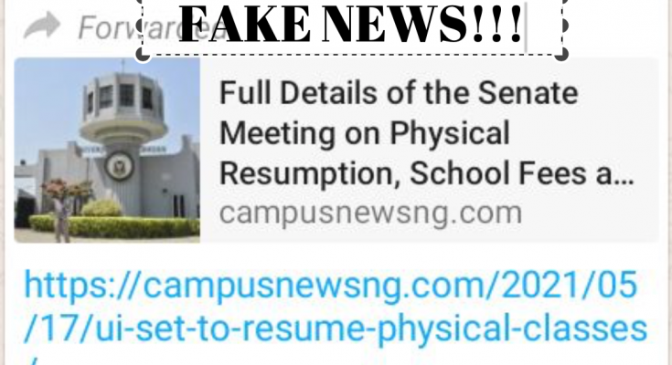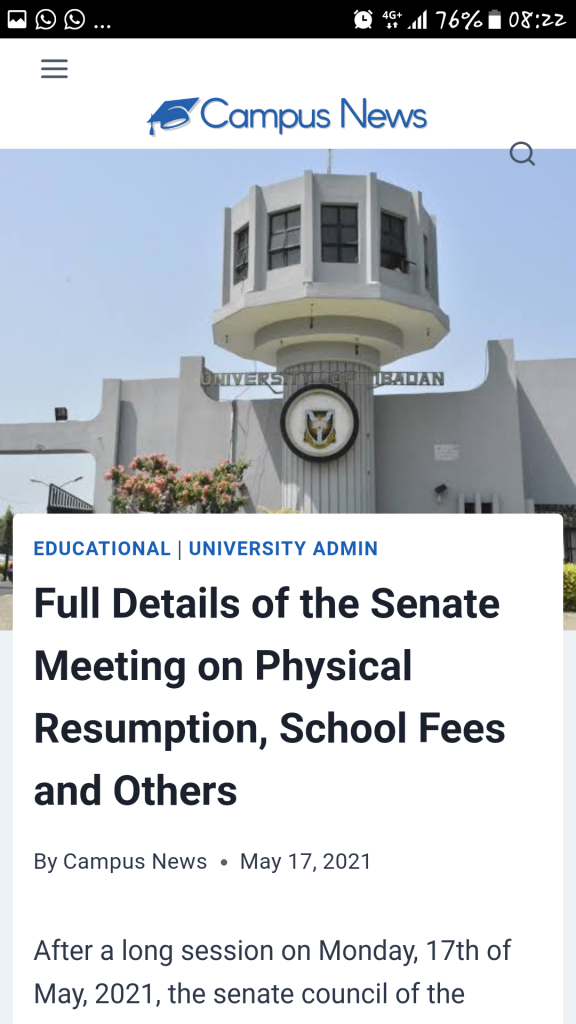 A report titled “Full Details of the Senate Meeting on Physical Resumption, School Fees and Others” made by a student-owned blog with the name Campus News made rounds on whats pp groups yesterday, May 17th immediately after the Senate meeting held at the UI Trenchard Hall.