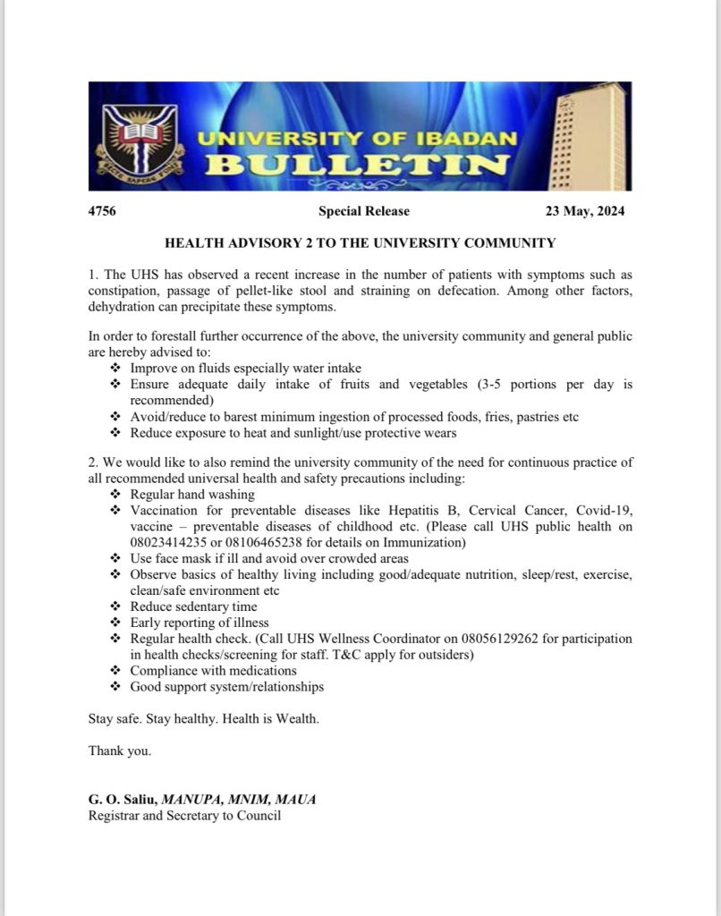 University Health Services (UHS) of the University of Ibadan has reported a rise in patients experiencing constipation, pellet-like stool, and straining during defecation, due to dehydration.