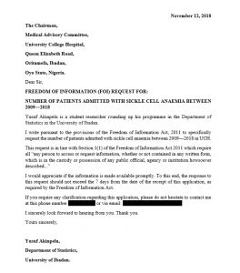 On July 9, Shamsudeen made a request to obtain the number of patients with sickle cell anemia admitted by the College Hospital over the last ten years to assist his project work.