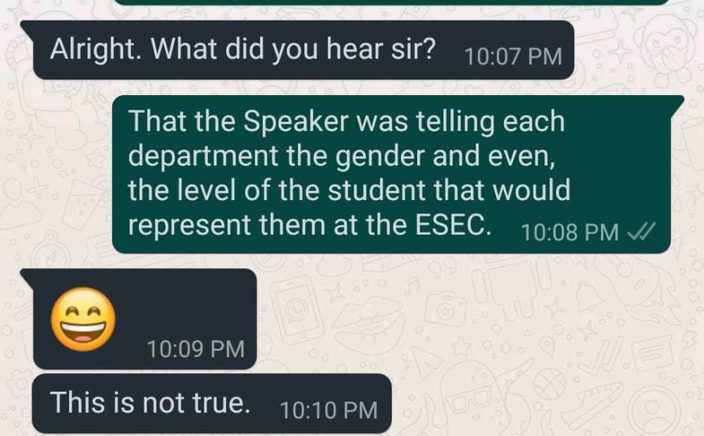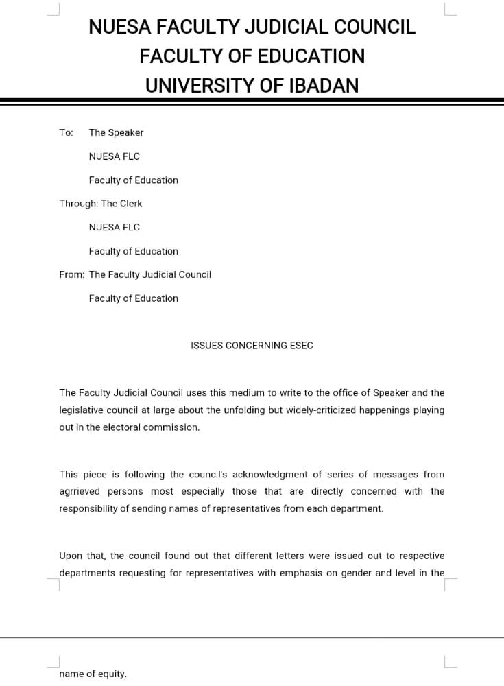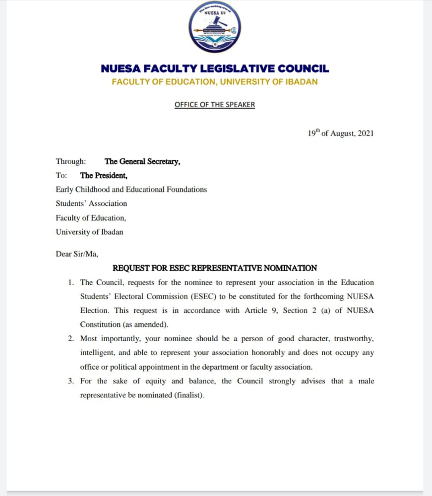 After the plenary session on Saturday, 12 September at A204/205 room in the Faculty of Education, this reporter heard some crucial issues going on in the Faculty. First, on the newly inaugurated Education Students Electoral Commission (ESEC). It was made known to the reporter that the office of the Speaker, through a letter, asked each department to nominate a student to be member of the ESEC. The letter contained that the NUESA FLC Speaker, Rt. Hon. Bolaji Ayinde stated the level(s) in which the nominees should come from, as well as the gender they must be. Meanwhile, in accordance with the constitution, each department is meant to select or nominate student(s) of their choice as members of the electoral commission.