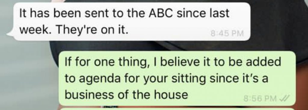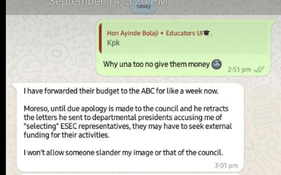 Immediately after the publication of the interview granted by the Chief Judge, the Speaker was caught in a chat boldly saying that the Chief Judge needed to apologize to the House, and thereafter retracts the letter he sent to address the ESEC issue, or else they seek funds from external bodies.