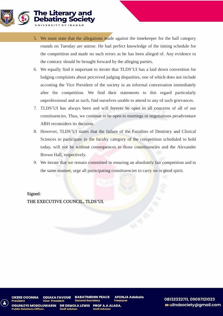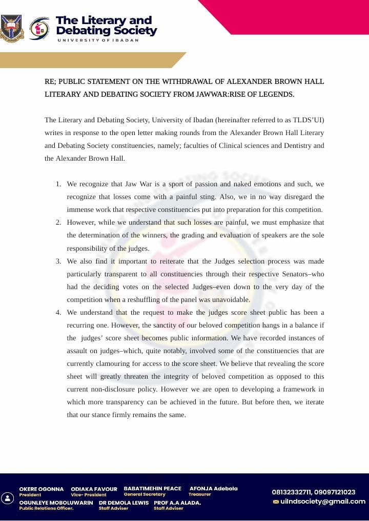 The Literary and Debating Society, University of Ibadan (TLDS’ UI), has responded to the controversial withdrawal of Alexander Brown Hall (ABH) Literary and Debating Society from the ongoing 2024 edition of Jaw War: Rise of Legends.