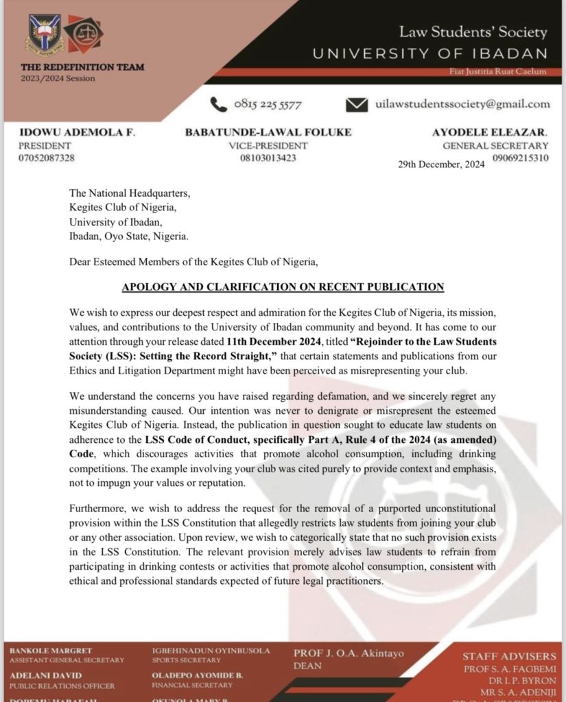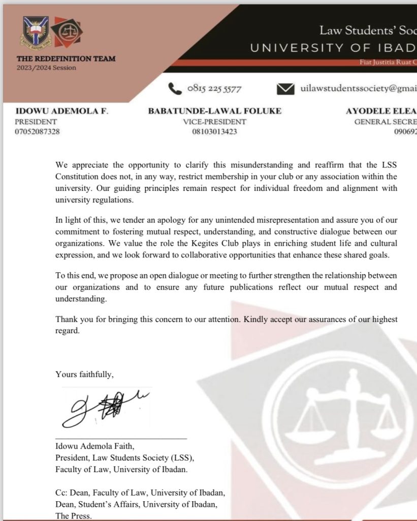 The Law Students Society (LSS) of the University of Ibadan has issued a formal apology to the Kegites Club of Nigeria following concerns raised about a recent publication by the LSS Ethics and Litigation Department.