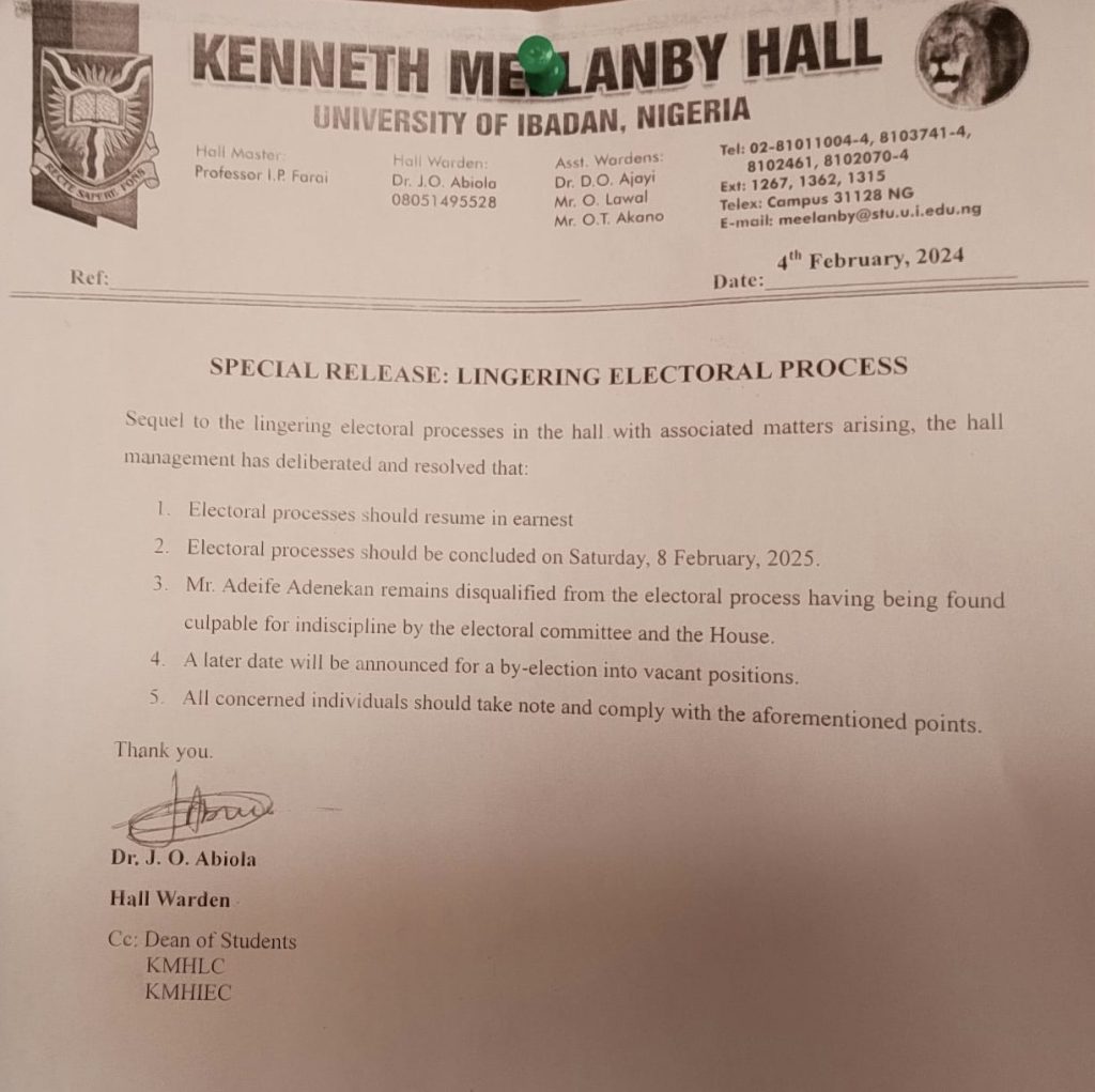 In this special release, the hall management ordered the immediate resumption of electoral activities while still maintaining the disqualification status of Adenekan Adeife. The management added that every electoral activities must be concluded by Saturday, February 8, 2025 and that by-election would be announced in a later date for any vacant position.