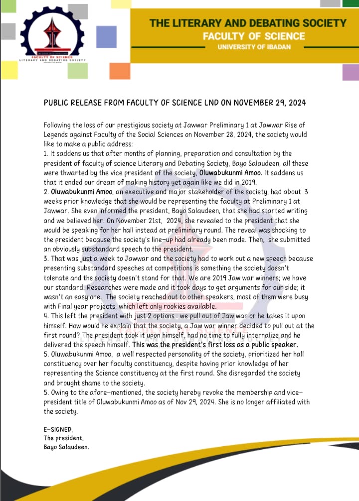 The Faculty of Science Literary and Debating Society at the University of Ibadan has made a public release following their loss at Jawwar 2024: Rise of Legends during the preliminary round against the Faculty of The Social Sciences on November 28, 2024.