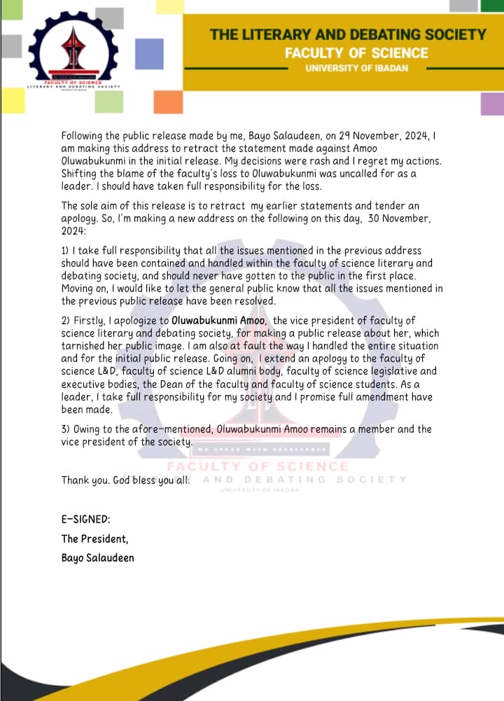 The President of the Faculty of Science Literary and Debating Society, University of Ibadan, Bayo Salaudeen, has issued a public retraction and apology following a controversial release on November 29, 2024, that blamed the society’s loss at ‘Jawwar 2024’ on its vice president, Oluwabukunmi Amoo.