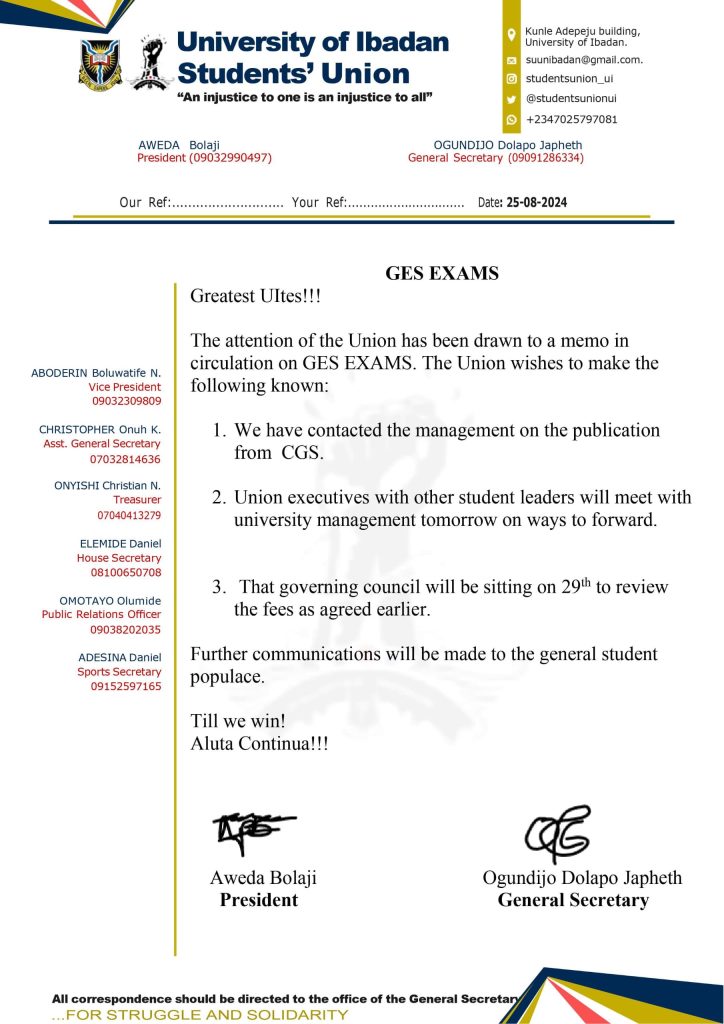The release also revealed that the Union leadership will be meeting with the management on Monday on the publication from the CGS directing all students to complete registration before August 28.
