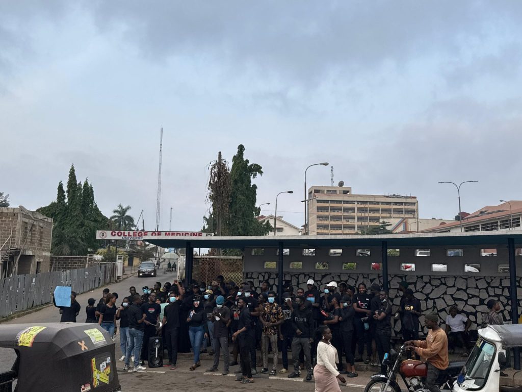 As of Press time, a crowd has built up at the bus-stop in front of the College of Medicine Gate and UCH Main Entrance. Members of the Students’ Union Executive Council are also present, having arrived with a contingent from the University.