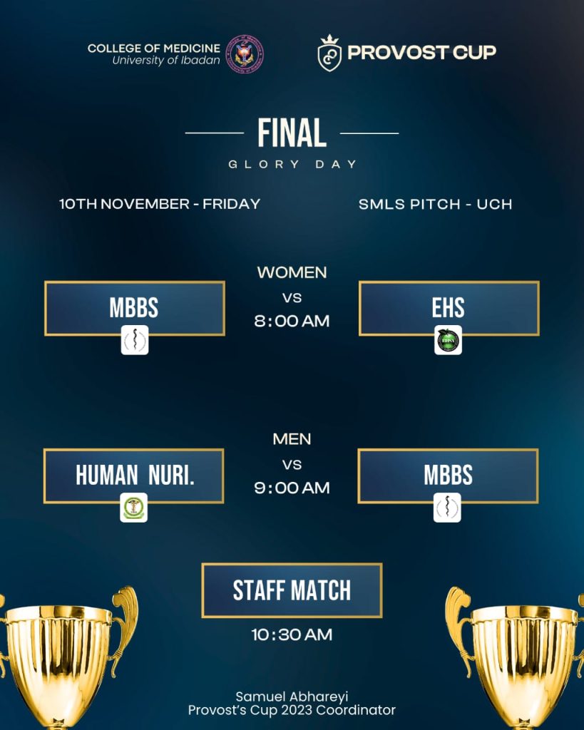 Following the disqualification, Human Nutrition get a bye in the third-place game and are bronze winners in the Provost Cup female event. MBBS are the second finalists and will face EHS on Friday, 10th November, 2023”. It was signed by the Head of the Provost Cup Planning Committee, Samuel Abhareyi, and accompanied by the statement “DIRECTIVES FROM THE DEPUTY PROVOST”.