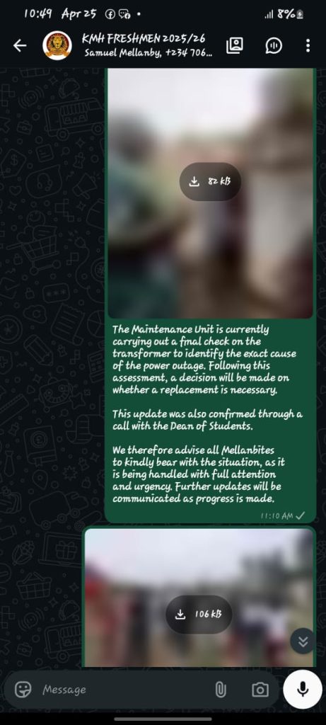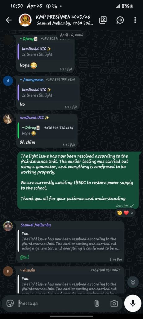 Specifically, the Executive Council of Kenneth Mellanby Hall solely provided water supply and generator support. We ensured residents had access to charging facilities three times daily, a measure that remains in place to this date. Important updates were regularly passed across to Mellabites to keep everyone informed of these ongoing developments.