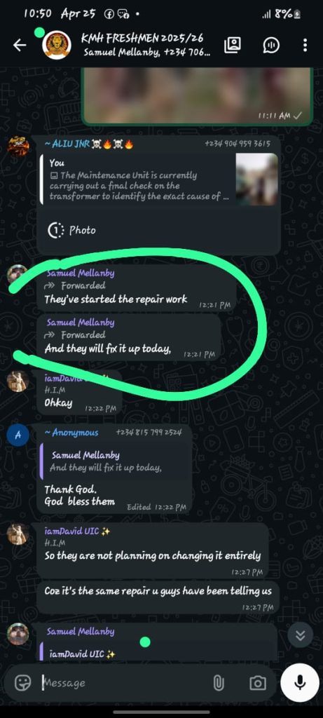 Furthermore, the Union President did not personally visit the transformer site until he was directly confronted in his office and urged to take action. During my engagements with the Director of Maintenance and other university authorities, it became evident that the Students’ Union had made no meaningful intervention or consistent follow-up to facilitate a solution.In stark contrast, the Hall Executive Council, Stakeholders and I were actively working behind the scenes to provide relief and maintain order. We were neither silent nor absent. We remained engaged with relevant stakeholders, including the maintenance unit and TIFASE, the Students’ Union House Secretary, making repeated visits to ensure the issue received attention. These were practical interventions, not mere public statements.