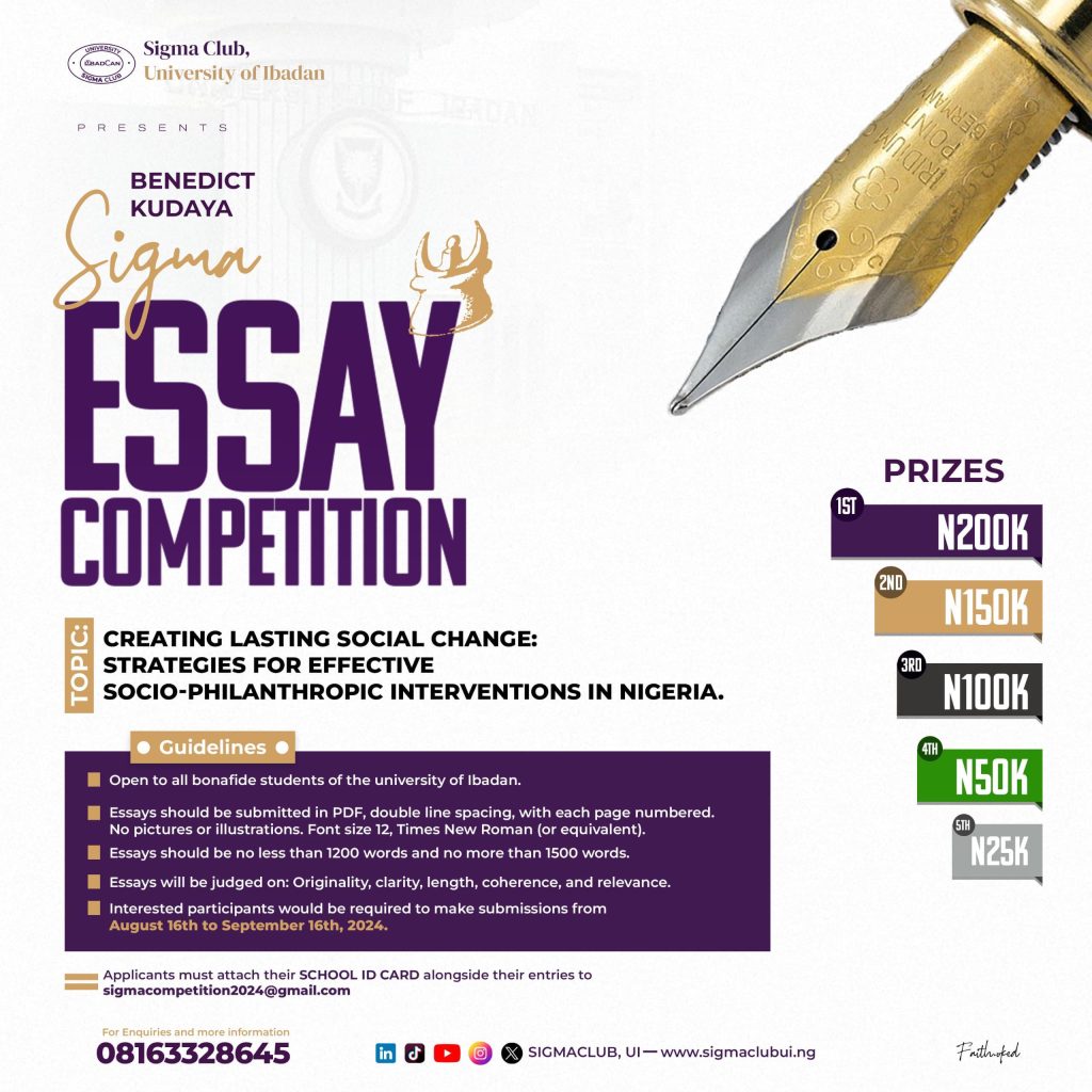 The SIGMA Club, University of Ibadan has announced call for entries for the Benedict Kudayah Essay Competition.