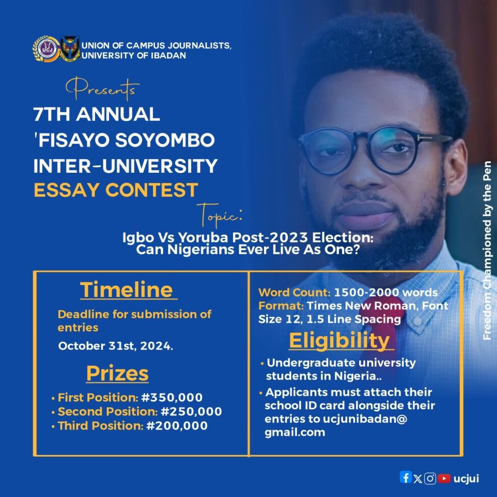 The Call for Entries for the 7th Edition of the annual Fisayo Soyombo Inter-Varsity Essay Competition has been announced by the Union of Campus Journalists, University of Ibadan.