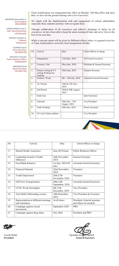 The 2-page report presented by Aweda Bolaji outlined twenty-one activities undertaken by the Union leadership in 2024.