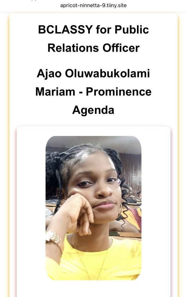Ajao Oluwabukolami Mariam, popularly known as BClassy, declared her Public Relations Officer aspiration via a widely circulated Whatsapp broadcast on November 15th, 2024. In this broadcast, the third year Faculty of Education student dubbed herself woman commando and encouraged the student community to support her “groundbreaking movement.”