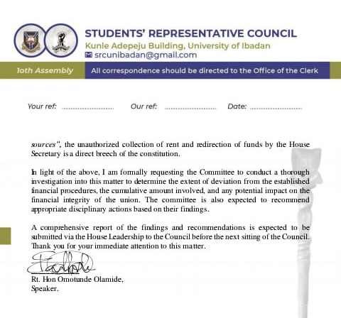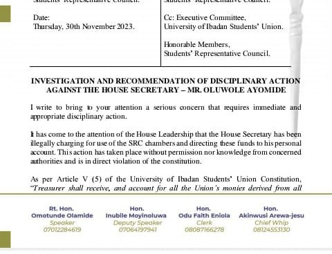 The House Secretary of the University of Ibadan Students’ Union, Oluwole Ayomide, popularly known as Sanjay, is directing funds meant for the Union into his personal account, the Speaker of the Students’ Representative Council, Omotunde Olamide, has alleged.