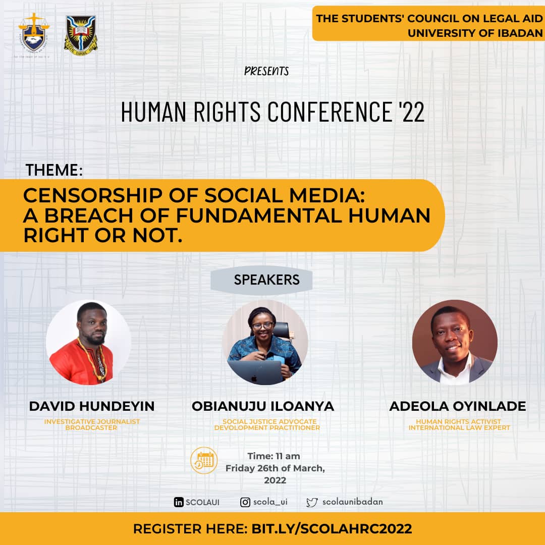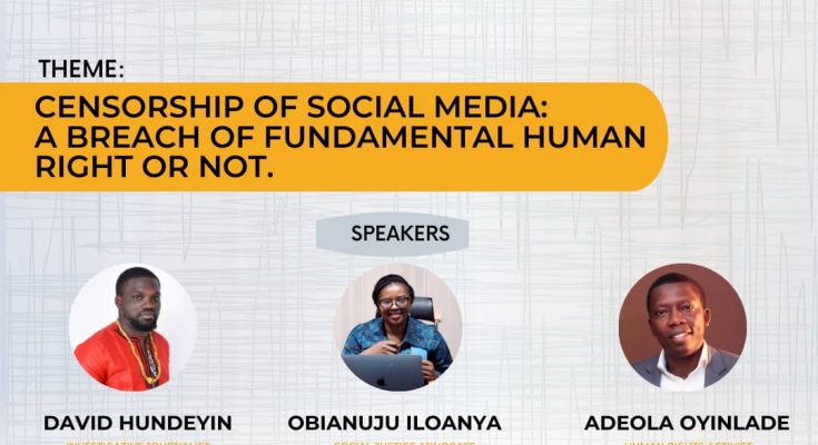 The three key speakers- Hundeyin; Investigative journalist, Obianuju Iloanaya; Social justice advocate and Adeola Oyinlade; Human right activist- will be speaking on the theme: “Censorship of social media: A breach of fundamental human right or not’‘.