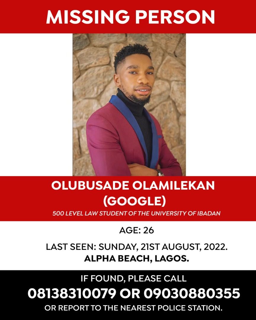 As per a report from The Law Press UI, a 500-level student, and immediate past president of the Faculty of Law, University of Ibadan, Olamilekan Olubusade more commonly known as Google, has been confirmed by the family through the elder brother, Mr. Ayorinde Olubusade to be missing after he reportedly drowned while swimming at a private beach — Alpha Beach, Lekki, Lagos – on Sunday, 21st August 2022. According to a public notice released by the elder brother yesterday, efforts are still ongoing to rescue and recover him— alive.