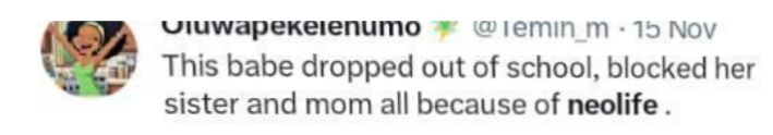 According to one Zainab, a student of University of Ilorin who took to her Twitter handle to narrate her encounter with Neo-life, she expressed gratitude at having “escaped” from the organization. She also warned people to shun any advances from Neo-life, while tagging people to launch a campaign against them.