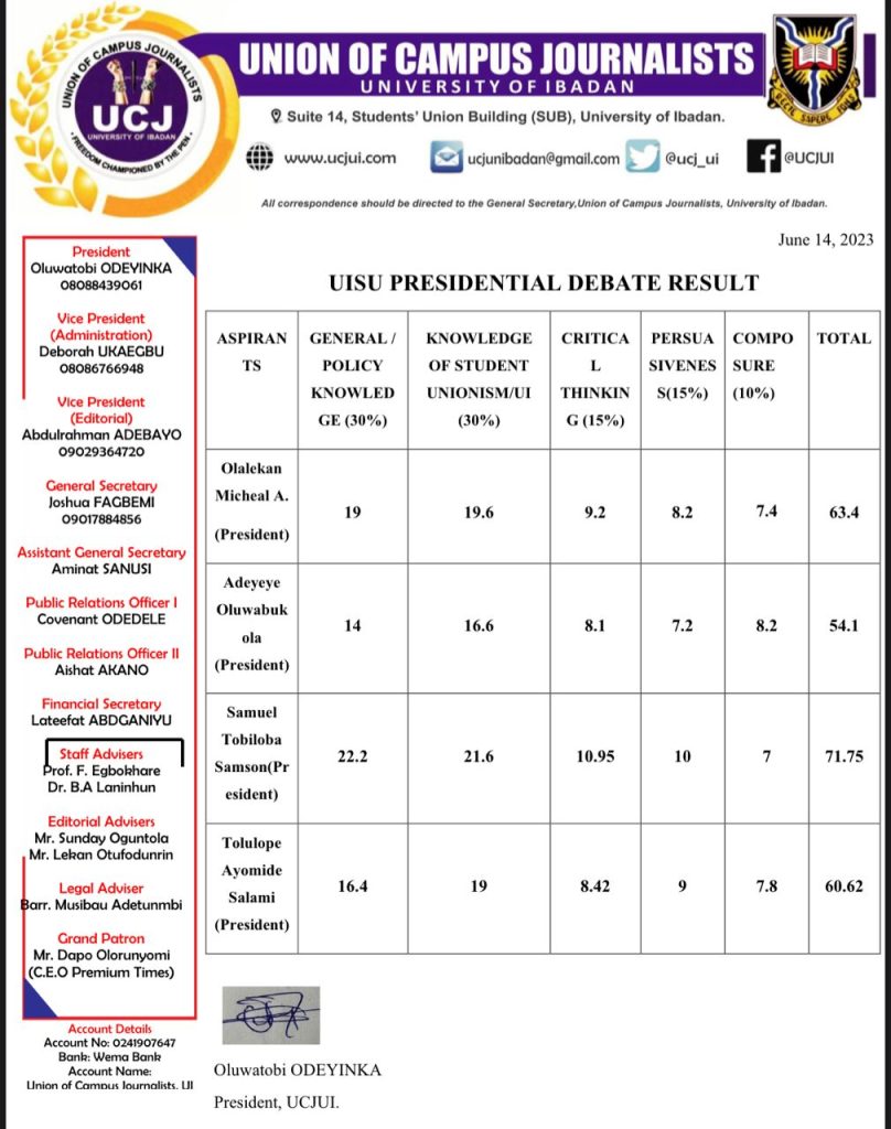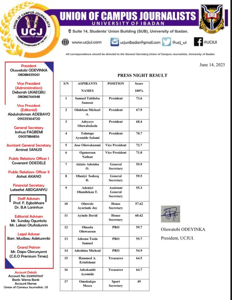 The Union of Campus Journalists, University of Ibadan has released the results of the Press night and Presidential debate conducted today.
