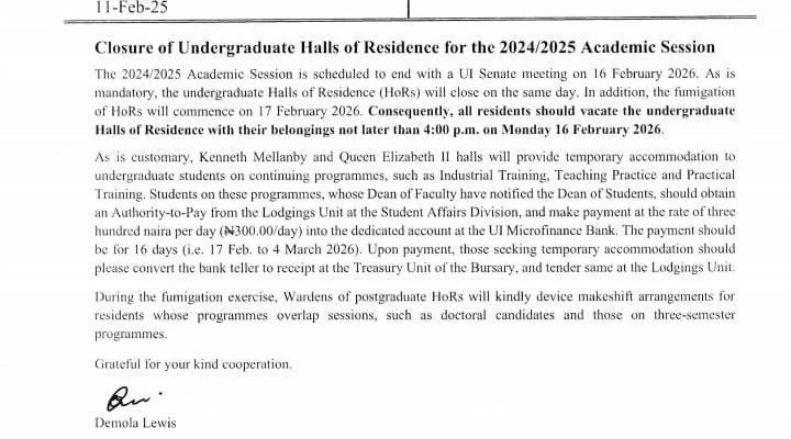 The announcement which was made through an internal memorandum from the Office of the Dean of Students, Prof. Demola Lewis, to all Hall Wardens within the university, had stipulated 04:00 am on Monday, 16th of February, 2026 as the final time and date for the closure of the Halls of Residence, for the 2024/2025 academic session, mandatorily after the UI Senate Meeting, which is going to take place on the same date.