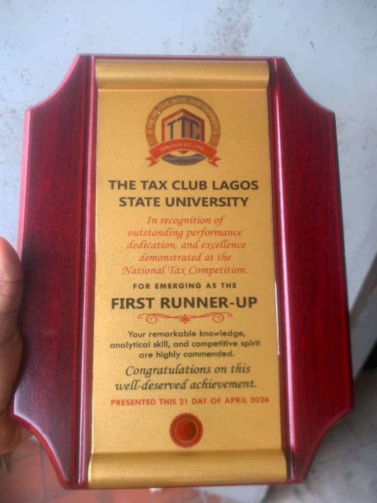 The Tax Club, University of Ibadan, has secured the first runner-up position at Tax Engage 2026, held at Aderemi Makanjuola Hall, Lagos State University (LASU), on Monday, 21 April 2026.
