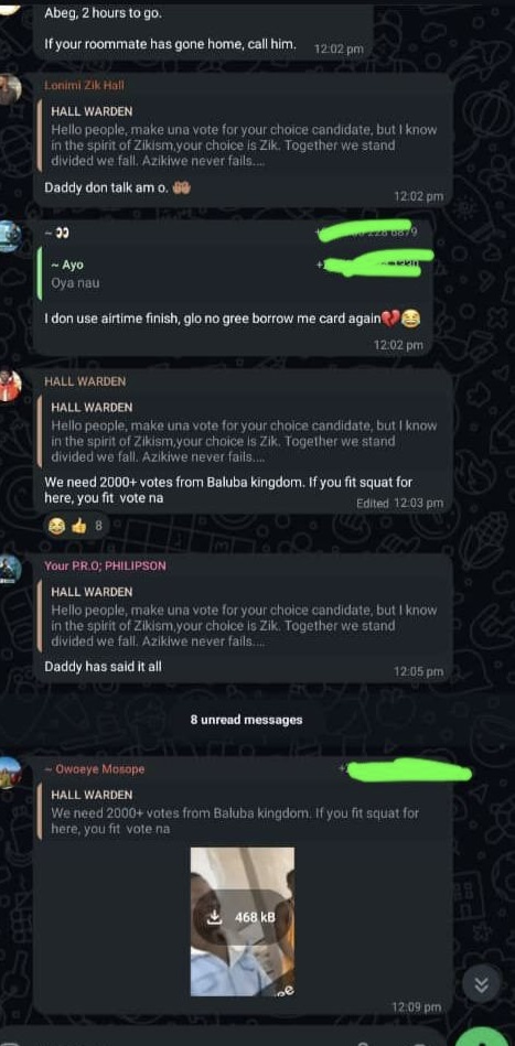 In messages shared in a WhatsApp group, Issues Affecting Zik Hall, Dr. Adelekan urged the residents to vote along hall lines, writing: