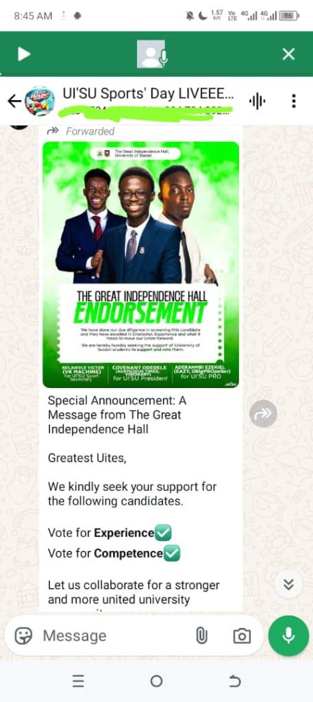 Aspirants have also been observed moving about different Halls, with supporters taking to branded messages asking others if they have voted. In some extreme cases, like with Zik, supposed supporters of the opposition Presidential candidate have been kicked out, while on other Hall groups, residents are being enjoined to vote along Hall lines and for endorsed candidates.