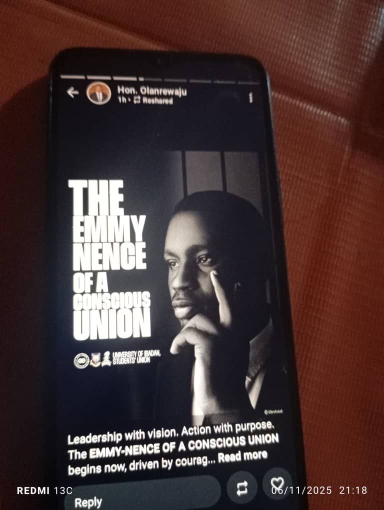 On 6 November 2025, several University of Ibadan students (UItes) noticed a WhatsApp status update from Hon. Olanrewaju, who had reshared the campaign graphic of Emmanuel Olawoye, the AGS of the Union, currently facing a disciplinary investigation over alleged financial misconduct during the Union’s Freshers’ Week event.